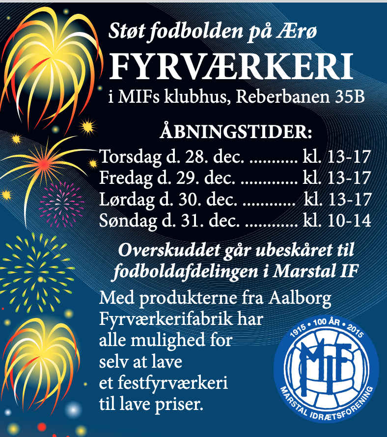 Som de tidligere år, sælger vi fyrværkeri i garagen ved klubhuset - Reberbanen 35B, Marstal