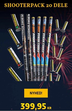 Shooterpack er pakken for den kræsne Teenager. Pakken indeholder et mix af Bomberør og shottubes, i alt 20 enheder. Bomberørene er alle 5 skuds i henholdsvis 25mm/44gr Nem og 20mm/33gr Nem pr. stk. Begge bomberørs varianter er med mixed effekter. Shottubes er i 30mm/23gr Nem og 20mm/8gr Nem pr. stk., og med blandede effekter hvilket gør dem til nogle af markedets bedste Shottubes. |