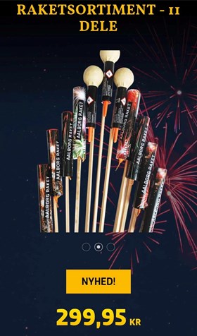 Årets raketpakke med alt hvad hjertet kan begære. 11 raketter fra 30gr til 60gr Nem pr. stk. med effekterne Hængende brokade med blå stjerne Hængende brokade med sølv Glitter Brokadekrone med white glitter GuldPalme med guld chrysanthemum Rød dahliablomst chrysanthemum Guld titaniumpalme & chrysanthemum Guldbrokadekrone & lilla peonyblomst Guldwillow med grøn & sølv strobe |
