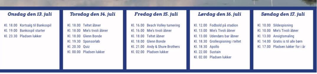 Sæt et stort kryds i kalenderen så du ikke risikerer at gå glip af: banko, QUIZ, grolle-volley, ANDY & SHURE BROTHERS, tivoli, SUSTAIN, fodbold på stadion, kolde øl, GRILLFEST I DANSETELTET, sildespisning m.m.